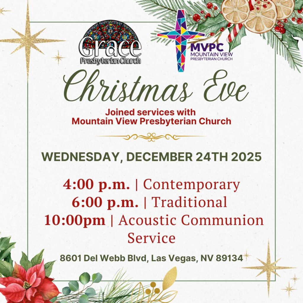 We warmly invite you and your family to join us for Christmas Eve as we partner with Mountain View Presbyterian Church for their Christmas Eve services. Join us for one or all of the services of the night!