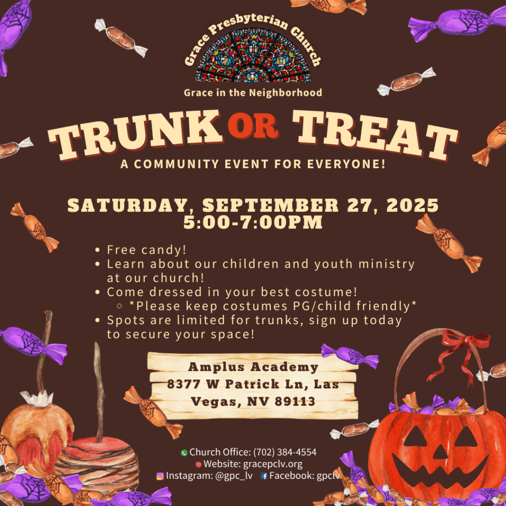 Join us for a fun-filled day at our Trunk or Treat where you and your little ones can enjoy free candy! While you’re here, take the opportunity to learn more about our children and youth ministry. Don’t forget to come dressed in your best costume, but please ensure it’s PG and child-friendly. We look forward to seeing you there!